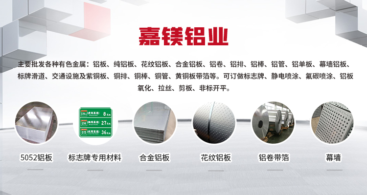 嘉鎂鋁業(yè)(上海)有限公司主要批發(fā)各種有色金屬:鋁板、純鋁板、 花紋鋁板、合金鋁板、鋁卷、鋁排、鋁棒、鋁管、鋁單板、幕墻鋁板、 標(biāo)牌滑道、交通設(shè)施及紫銅板、銅排、銅棒、銅管、黃銅板帶箔等